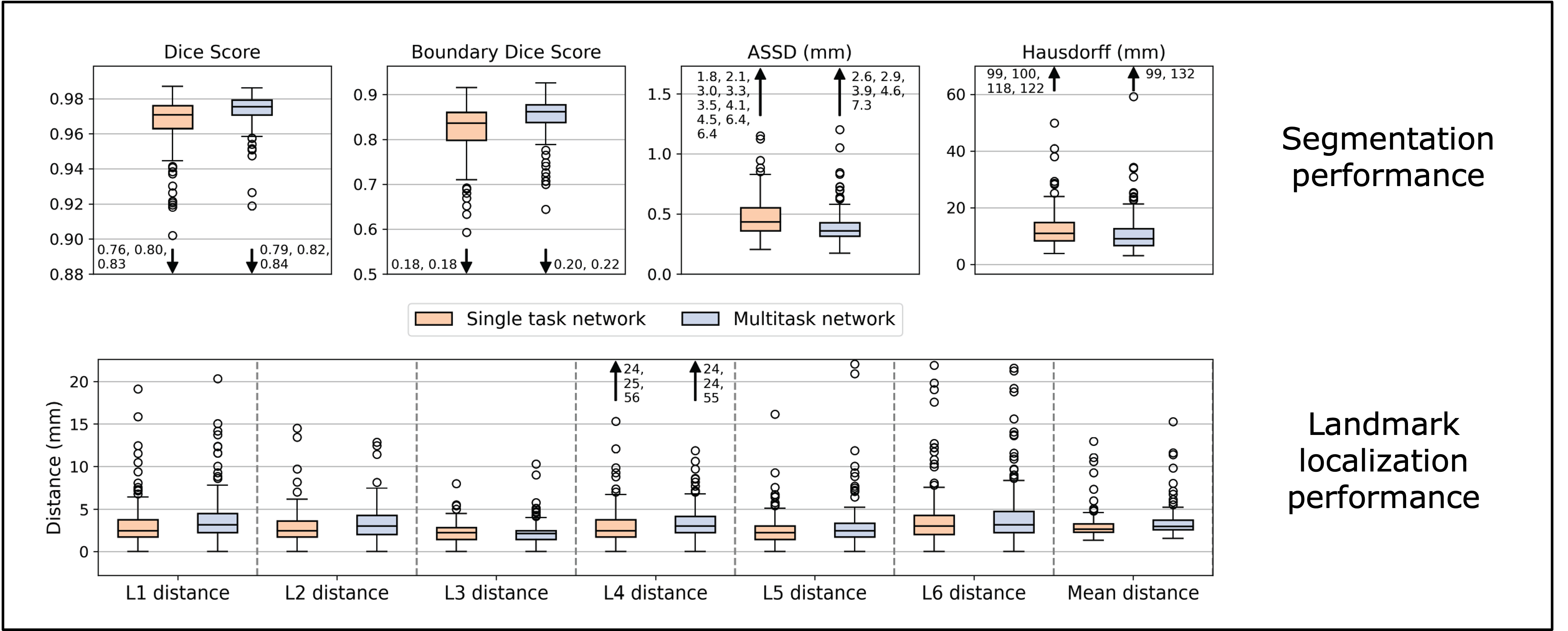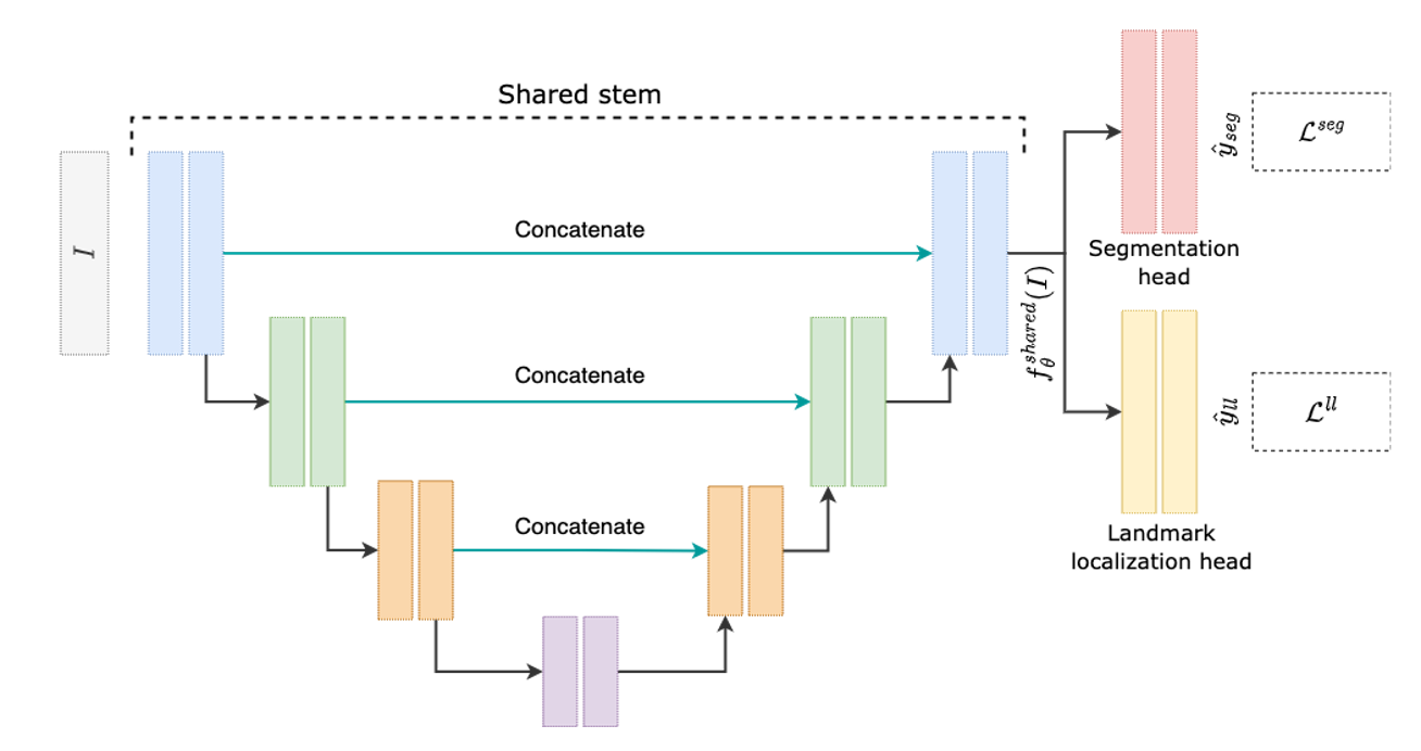 Our problem has two tasks, segmentation and landmark localization. We trained two separate “single task” U-Nets to perform these functions and compared their performance to a single “multitask” U-Net trained to perform both functions. Using 5-fold cross validation and paired t-tests, we found that the multitask network performed better at segmentation \((p<0.0002)\) while the single tasks network approach led to better landmark localization \((p<0.0001)\).